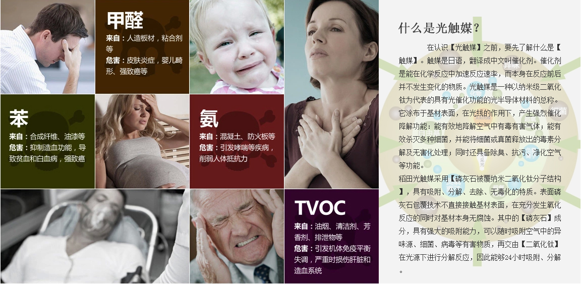 在認識【光觸媒】之前,要先了解什么是【觸媒】。觸媒是日語,翻譯成中文叫催化劑。催化劑是能在化學反應中加速反應速率,而本身在反應前后并不發生變化的物質。光觸媒是一種以納米級二氧化鈦為代表的具有光催化功能的光半導體材料的總稱。它涂布于基材表面,在光線的作用下,產生強烈催化降解功能:能有效地降解空氣中有毒有害氣體;能有效殺滅多種細菌,并能將細菌或真菌釋放出的毒素分解及無害化處理;同時還具備除臭、抗污、凈化空氣等功能。 稻田光觸媒采用【磷灰石被覆納米二氧化鈦分子結構】,具有吸附、分解、去除、無毒化的特質。表面磷灰石包覆技術不直接接觸基材表面,在充分發生氧化反應的同時對基材本身無腐蝕。其中的【磷灰石】成分,具有強大的吸附能力,可以隨時吸附空氣中的異味源、細菌、病毒等有害物質,再交由【二氧化鈦】在光源下進行分解反應,因此能夠24小時吸附、分解